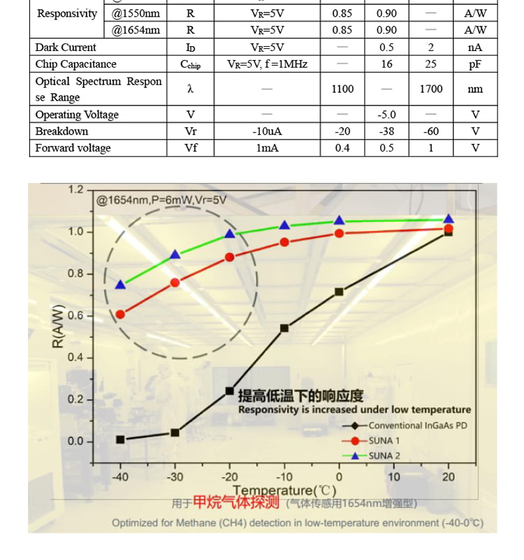 ● Optimized for Methane(CH4) detection(1654nm),improving responsivity in low-temperature environment