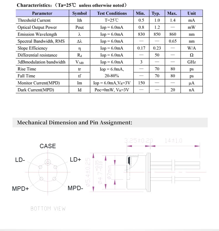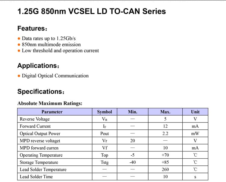 1.25G 850nm VCSEL LD TO-CAN Series laser diode