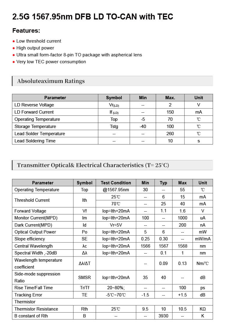 2.5G 1567.95nm DFB LD TO-CAN with TEC