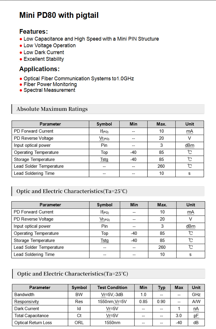 Mini PD80 with pigtail photodiode