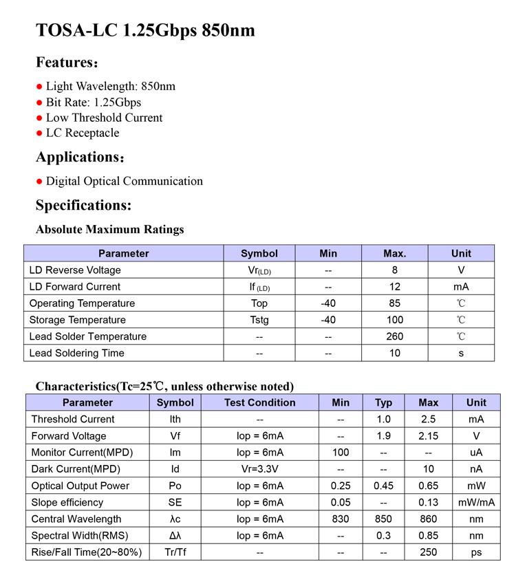 TOSA-LC 1.25Gbps 850nm Transmitter Optical Subassembly